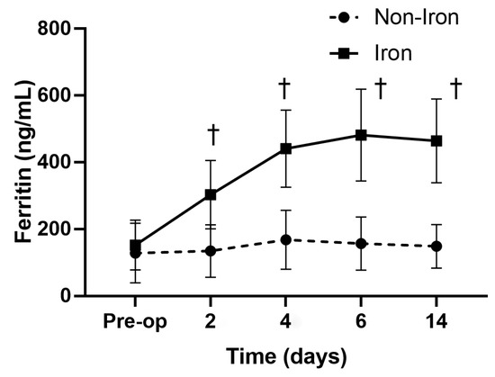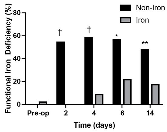 Serial changes in functional iron deficiency (%). Functional iron deficiency values were significantly lower in the iron group than in the non-iron group on postoperative days 2, 4, 6, and 14. † p < 0.001, * p = 0.001, ** p = 0.002.