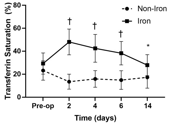 Serial changes in transferrin saturation. Transferrin values were significantly higher in the iron group than in the non-iron group on postoperative days 2, 4, 6, and 14. † p < 0.001, * p = 0.012.