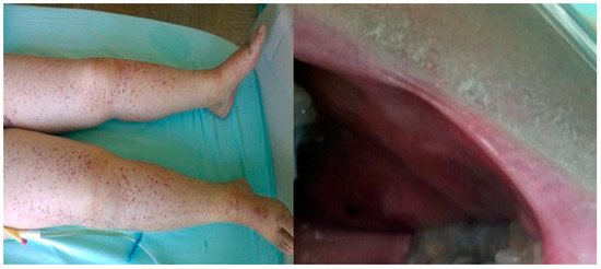 Skin hemorrhage at the lower extremities and in mouth mucosa—Case 1.