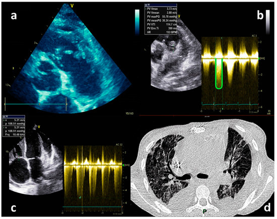 A male aged 38 years was referred to our hospital from the clinic for infectious diseases, with a diagnosis of severe sepsis. He experienced 5 days of symptoms of increased temperature up to 40 °C, fatigue, myalgia, and photophobia. An initial brain CT scan and ultrasonography of the abdomen revealed no significant changes. Antibiotic treatment was initiated with levofloxacin. After TTE suggestive of PVIE the patient was transferred to our hospital. His medical history included tetralogy of Fallot surgical repair at the ages of 1 and 7. At admission to our hospital, he had symptoms and signs of heart failure (HF) and multiple organ failure (MOF). A whole systolic murmur (4/6) was heard at the precordium. Laboratory tests at admission found a leucocyte count of 20.33 [ref. 4–10] × 109, hemoglobin 117 [ref. 120–170] g/L, PLT 39 [ref. 150–400] × 109, CRP 155 [ref. 0.0–0.05] mg/L, creatinine 416 [ref. 50–120] μmol/L; eGFR 15 mL/min/1.73 m2, NT-proBNP: >25,000 [ref. 0.0–125.0] pg/mL, procalcitonin: 50.68 [ref. 0.0–0.05] ng/mL, hs-Troponin: 151.4 [ref. 0.0–25.0] ng/L; D-Dimer: 5018.88 [ref. 0.0–500.0] ng/mL. TTE revealed massive PV vegetation (Video S2: Pulmonary valve vegetation) (dimension 2.4 × 0.7 cm), residual ventricular septal defect (VSD) in the membranous part of the interventricular septum, impaired left ventricular systolic function with EF of 25–30%, right ventricular enlargement with decreased systolic function (TAPSE = 1.5 cm; FAC = 43%; S’ = 0.08 m/s), and pulmonary hypertension of 43 mmHg (Figure 4a–c). He was treated with therapy attributed to heart and renal failure: diuretics, dobutamine, noradrenaline, and continuous venovenous hemodiafiltration (CVVHDF). During the hospitalization, several antibiotics were used (metronidazole, linezolid, ceftriaxone) and no positive blood cultures were found. On the first day after the admission, the hospital ET indicated PV homograft surgery. On the second hospital day, the patient experienced deep neurological deterioration. Magnetic resonance of the brain (Figure 4d) showed multiple septic embolizations. His EurSCOREII was 83.23%. Unfortunately, the lack of PV homograft and neurological complications led to postponing the cardiac surgery procedure and resulted in a lethal outcome on the 12th day of hospitalization, due to a hemorrhagic transformation of ischemic stroke.