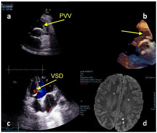 Echocardiography and MRI imaging—Case 2. (a) Floating vegetation in the RVOT. (b) TTE + 3D reconstruction. (c) Residual VSD; (d) MRI—Multiple septic brain embolization.