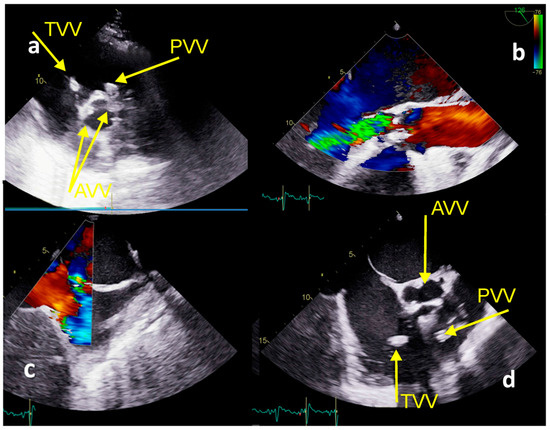 Echocardiography TTE and TEE imaging−Case 3. (a) TTE: TVV−vegetation at the tricuspid valve, PVV−vegetation at the pulmonary valve, AVV−vegetations at the aortic valve; (b) TOE−severe aortic regurgitation; (c) TOE−patent foramen ovale; (d) TOE−vegetations at the tricuspid, pulmonary, and aortic valves.