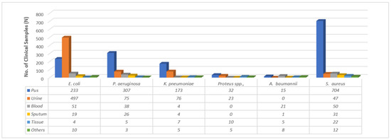 Staphylococcus aureus was the second most common pathogen isolated in our study, highly dominant in pus where they cause skin infections, and is also a major cause of bloodstream infections (BSI) [82,83]. The current data in our study indicated that penicillins, cephalosporins, macrolide and quinolone antibiotics are no longer active against multidrug-resistant pathogens. Even now, these pathogens have developed resistance against linezolid and glycopeptides which also needs addressing going forward [84,85,86].