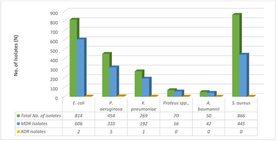 - Saeed, D.K.; Farooqi, J.; Shakoor, S.; Hasan, R. Antimicrobial resistance among GLASS priority pathogens from Pakistan: 2006–2018. BMC Infect. Dis. 2021, 21, 1231. [Google Scholar] [CrossRef] [PubMed]