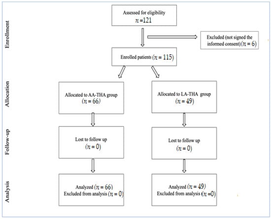 Following the selection criteria, 121 patients were included in the study, of which 6 did not sign the informed consent form. Of the remaining 115 patients, 66 underwent hip arthroplasty through an anterior approach, and 49 through a lateral approach.