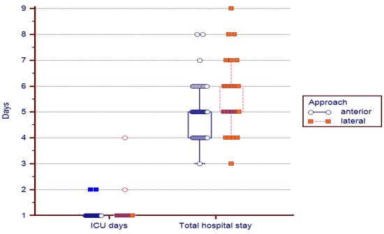 Statistical data concerning the length of stay (LOS) showed significant differences regarding the total days spent in the hospital (a 5 days average with an 4–5 interquartile range for the anterior approach vs. 5 days with 5–6 interquartile range for the lateral approach, p = 0.0312), but not for days spent in the intensive care unit (1 day average with an 1–1 interquartile range for the anterior approach vs. 1 day average with an 1–1 interquartile range for the lateral approach, p = 0.7733); Figure 3.