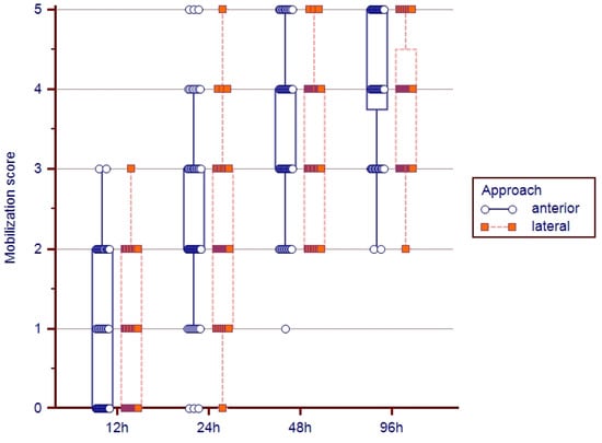 Gradual postoperative mobilization was faster for patients undergoing surgery via the anterior approach. The value results expressed by median values of the mobilization scores are reproduced in Table 2 and Figure 4.