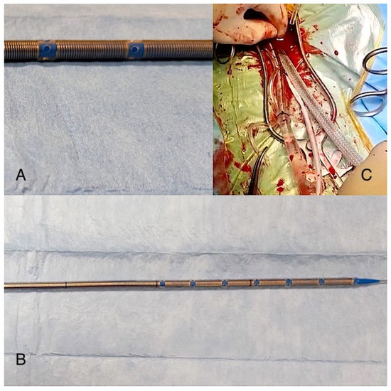 The virtually wall-less cannula (Smartcannula LLC, Lausanne, Switzerland) features a long tubular grid placed inside the inferior vena cava, the right atrium, and the superior vena cava. There is a covered terminal part that is usually out of the femoral vein and connected to the cardiopulmonary circuit.