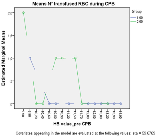 The figure shows the plot separated by group (Group 1, green line; Group 2, blue line) in which each point indicates the estimated marginal mean number of transfused RBCs adjusted for age at each pre-CPB hemoglobin value.