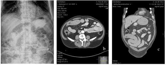 Initial imaging included chest and abdominal X-rays; the former was normal, while the latter revealed the presence of air-fluid levels in dilated loops of the small intestine, therefore confirming the initial diagnosis of an ileus (Figure 1a). The following day, an upper GI endoscopy (esophagogastroduodenoscopy) was performed, revealing mild gastritis of the intermediate region. The campylobacter-like organism (CLO) test was negative. On the same day, the patient underwent a contrast-enhanced abdominal computed tomography (CT) scan in order to decipher the cause of the intestinal obstruction. The results revealed proximally distended loops extending from Treitz’s ligament to the ileum, where a distinct transitional point was observed. In that particular segment, the ileum exhibited concentric thickening, indicating an intraluminal obstructive cause. Bowel loops distal to the obstruction appeared collapsed (Figure 1b,c). Additional findings included pericolic fluid retention, as well as fluid in the pouch of Douglas (POD), with slightly enlarged mesenteric lymph nodes adjacent to the caecum. Taking into consideration the patient’s advanced age, the above imaging findings raised suspicion of a possible malignancy.