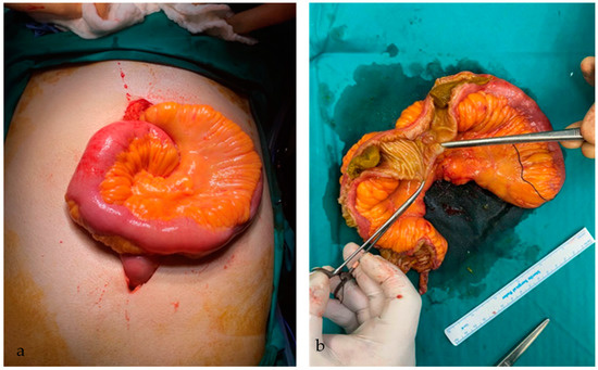 In the distended segment of the small bowel, visible ulcerations and hypertrophy of the mesenteric fat were also observed. Notably, the thickening and extension of the fat around the circumference of the intestine were similar to “creeping fat”, which is associated with Crohn’s disease (Figure 2a). Owing to the frailty of the intestinal wall and the ischemia resulting from the intussusception, we proceeded with segmental enterectomy 20 cm proximally to the ileocecal valve, with consequent entero-enteric side-to-side anastomosis, using linear surgical staplers. The entirety of the abdominal cavity was consequently rinsed with normal saline, and two drainage tubes were inserted bilaterally in the POD. The patient tolerated the procedure well.