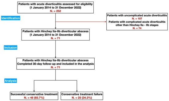 This was a retrospective cohort study that included patients admitted from 1 January 2014 to 31 December 2022 at the Emergency Surgery Unit of the Cagliari University Hospital (Italy) with a diagnosis of acute diverticulitis complicated with grade IIa and IIb Hinchey diverticular abscess. Inclusion criteria were as follows: patients ≥18 years old with a Hinchey IIa or IIb diverticular disease documented with contrast-enhanced CT, and patients who underwent conservative treatment with antibiotic therapy and possible US or CT-guided percutaneous drainage of the abscess. In addition, patients diagnosed with uncomplicated acute diverticulitis or complicated acute diverticulitis other than IIa and IIb grades and patients undergoing emergency surgical treatment on admission were excluded. The patients were identified by searching the electronic register of the Surgical Emergency Department admissions. This study was conducted under the principles of the Declaration of Helsinki and was developed and presented according to Strengthening the Reporting of Observational Studies in Epidemiology (STROBE) []. Study approval was granted by the Institutional Review Board of the Cagliari State University Hospital (Italy), whereas ethical review was waived for this study due to its retrospective, non-interventional design.
