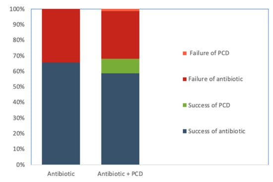 In eight cases (11.3%), CT-guided percutaneous drainage was associated with antibiotic therapy. The culture test report was available for all eight cases. The most detected bacteria were Escherichia coli (50% of the available sample, n. 4) and Klebsiella pneumoniae (25%, n. 2). Staphylococcus aureus, Staphylococcus epidermidis, Streptococcus anginosus, Morganella morganii, Enterobacter cloacae, Proteus mirabilis, Candida albicans were also found only once each.