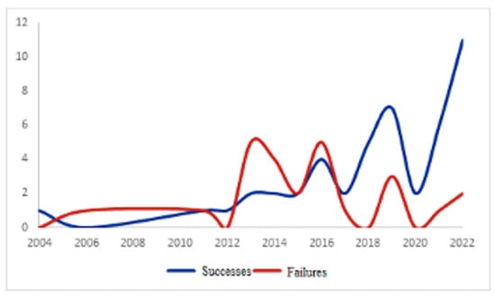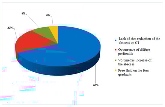 Conservative treatment failed in 25 cases (35.2%). Failure of the conservative treatment when the antibiotic therapy was associated with the use of percutaneous drainage was reported in two cases (Figure 2). The main reason for the failure of conservative management was the lack of size reduction of the abscess on the follow-up CT scan (68%; n. 17). The second reason was the occurrence of diffuse peritonitis at the physical examination (20%; n. 5). Additional reasons are shown in Figure 3. The median time between the initiation of conservative treatment and its failure was 12 days (IQR 8.0). For patients who underwent surgery after failure of conservative treatment, the primary approach was left hemicolectomy with primary anastomosis in 56% (n. 14) of patients, followed by left hemicolectomy with open abdomen (28%, n. 7), and colonic resection with Hartmann’s procedure (16%, n. 4). Complications occurred in seven (9.8%) patients. The grade of surgical complications, evaluated according to the Clavien-Dindo classification, was ΙΙ in 42.7% (n. 3) of cases. In contrast, grade I and a ΙΙΙb complications were found in 28.6% (n. 2) of the cases. The median length of hospital stay was 14 days (IQR 13.0). The length of hospital stay for cases with failure and success of non-operative management was 25.0 ± 8.2 days for patients with failure and 10.9 ± 5.5 days for patients with the success of conservative treatment (p < 0.001, 95%CI −17.4; −10.8), with a mean difference of −14.1. No abscess recurrence occurred after conservative treatment at 30-day follow-up after discharge. Conversely, in two cases, a recurrence was reported after 30 days, presenting as an abscess. As shown in Figure 4, starting in 2017, the rate of successful conservative treatment started increasing in conjunction with the implementation of CT-guided percutaneous drainage of diverticular abscesses larger than five centimeters.