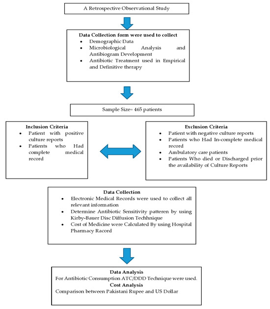 Electronic medical records were reviewed to collect demographic data, sample type, causative microbe, and antimicrobial treatment given in empirical and definitive treatment. Culture sensitivity reports were reviewed to collect data on the results of pathogen identification and susceptibility testing. The antibiotic susceptibility pattern of all the bacterial pathogens was determined by Kirby-Bauer Disc Diffusion Technique according to Clinical and Laboratory Standards Institute (CLSI) guidelines [45]. The interpretation of any test was undertaken according to CLSI guidelines as sensitive and resistant. In the case of positive culture reports, patients were observed for their whole length of hospital stay (from the day of positive culture report to the last day of their treatment) to determine the consumption of antibiotics, length of hospital stay, and the cost of the antibiotics prescribed. Susceptibility patterns of pathogens were noted in order to observe the pattern of culture-guided definitive therapy. The cost of medicines was calculated using the hospital’s pharmacy records.