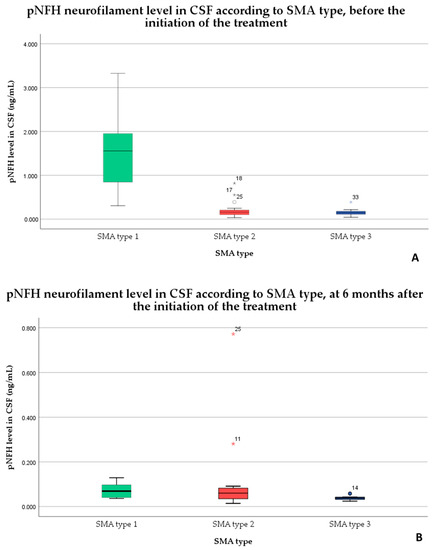 The pNFH levels in cerebrospinal fluid before (A) and 6 months after the initiation of the treatment (B) according to SMA type.