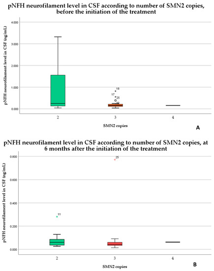 The pNFH levels in the cerebrospinal fluid before (A) and 6 months after the initiation of the treatment (B) according to the SMN2 copies.