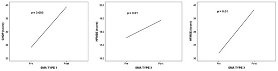 Analyzing the motor function evolution after the nusinersen treatment, based on the motor scale assessment scores and using a paired samples test, we found statistically significant improvement in all types of SMA, as shown in Figure 4:
