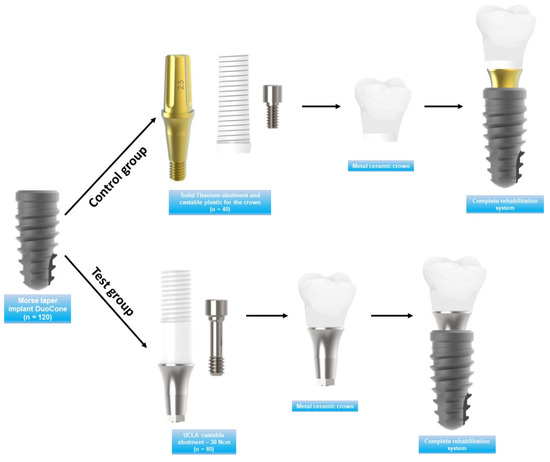 Morse taper (MT) connection implants, due to their biomechanical characteristics and advantages over hexagonal implants, have been frequently used for all types of rehabilitation (single and multiple, anterior and posterior) [10,15,16]. MT connection fundamentally depends on the fit’s accuracy between the implant’s internal and abutment cone. However, with the increased clinical use of this type of AI sets (MT connection), problems such as those with other implant connections began with MT implants, such as implants placed in areas with reduced inter-occlusal space. For this reason, castable abutments also had to be developed for the MT system. However, only a few behavioral clinical studies exist in the literature on this type of UCLA abutment for the MT connection.