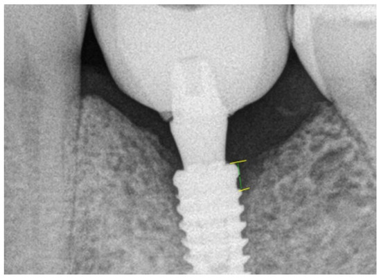 After having all data recorded and computed, the intra-examiner margin of error was calculated, which resulted in an average of 0.035 mm, indicating that the error was not statistically significant (p = 0.22, 95% CI). Figure 2 shows an image of the software calibration and the MBL measurement. An important observation is that all implants were installed at the crestal bone level.