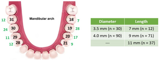 Details of the implant quantity distribution in the mandibular arch (green numbers) and table of implant dimensions (diameter and length) quantity.