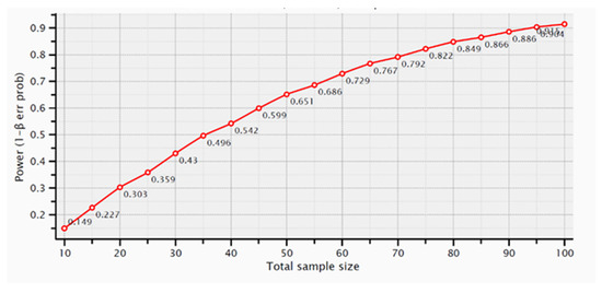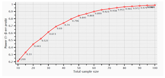 For distal bone loss, assuming mean and SD values of 1.2 ± 0.64 mm and 0.7 ± 0.42 mm, with correspondent sample sizes of 80 and 40 dental implants, respectively, the calculated effect size would be 0.92 and the achieved power 0.99. The graph of Figure 5 shows the samples number calculation for distal MBL.