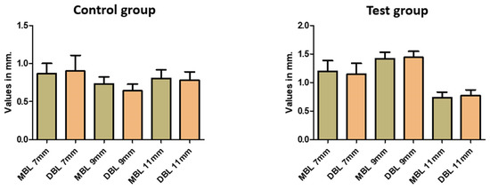Keratinized mucosa was considered thin or absent in 19 implants in the control group (47.5%) and 42 in the test group (52.5%). Mucositis was found in 11 implants in the control group (27.5%) and 27 in the test group (33.8%). A positive correlation was observed between the width of keratinized mucosa and mucositis (r = 0.521, p = 0.002). The overall mean marginal bone loss was 1.03 ± 0.62 mm, ranging from 0 to 3.2 mm. Figure 7 shows each implant length’s mean and standard deviation distribution of the marginal bone level (mMBL and dMBL). Table 4 shows the statistical comparison of the MBL values between the different implant lengths, and Table 5 shows the statistical comparison of the MBL intergroup at the same implant length.
