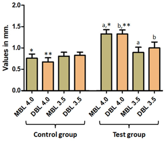 Regarding the implant diameter comparison, it is important to highlight the statistical significance found for marginal bone loss, which was greater in the test group for standard implants (ø 4.0 mm) than the narrow platform (ø 3.5 mm), and the similar diameter in the control group. Figure 8 presents the data and statistical comparison between the values obtained in each group.