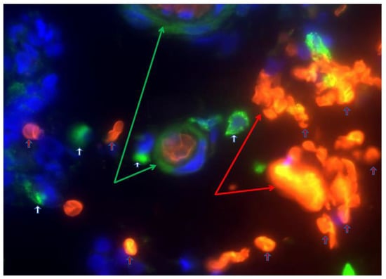 Depiction of extravasated erythrocyte macrophage erythrophagocytosis (EEME): Double immunofluorescent staining of the macrophage marker CD163 (green arrow) in paraffin-embedded sections from a patient with UC. Nuclei were counterstained with DAPI (blue). Red arrows indicate extravasated erythrocytes and white arrows indicate macrophages. Pictures were taken at 60× magnification. Green arrows depict macrophage erythrophagocytosis—a macrophage engulfing three extravasated erythrocytes (red arrows). Reproduced with permission from Myers et al., Inflamm Bowel Dis, 2014 []. Abbreviations: EEME, extravasated erythrocyte macrophage erythrophagocytosis; UC, ulcerative colitis.