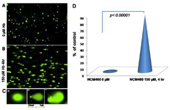 Comet assay, with Hbα causing DNA damage: (A) Normal human colon epithelial cells, NCM460, were fed with fresh complete media alone as a control, (B) with 150µM Hbα for 4 h followed by Comet assay to assess DNAD using denaturing electrophoresis. (C) (a) Undamaged cells, (b) damaged cells, and (c) severely damaged cells in an interpretation of the intensity of DNAD. (D) Quantification of the DNAD between the two groups. Reproduced with permission from Myers et al., Inflamm Bowel Dis, 2014 []. Abbreviations: NCM460, normal colonic epithelial cell line; DNAD, deoxyribonucleic acid–damage; Hbα, hemoglobin alpha.