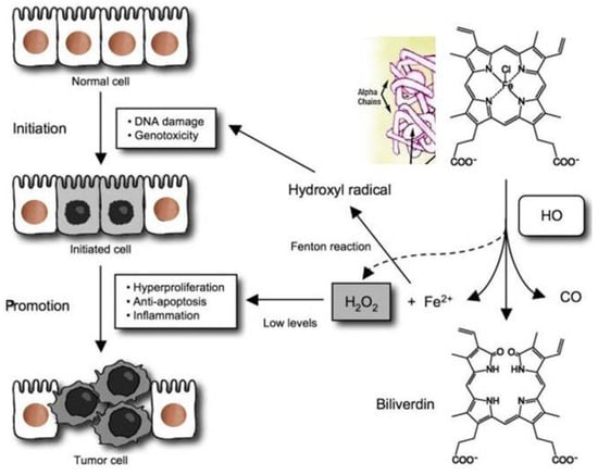 The pathophysiology of extracellular/exogenous HbαC and subsequent tumor associated with enhanced oxidative reaction, “the Fenton Reaction (FR)”: The FR here is the chemical response between exogenous HbαC and hydrogen peroxide, resulting in a hydroxyl radical, which is extremely receptive and exceedingly toxic/noxious to living cells and is an oncogenic trigger; this can also serve as a therapeutic target/strategy for cancer patients. The figure was downloaded for free, and modified for clarification []. Abbreviations: FR, Fenton Reaction; HbαC, hemoglobin alpha chain; HO, HO+, hydroxide, OH-, oxyhydride; CO, carbon monoxide; Fe2, iron (II); H2O2, hydrogen peroxide.