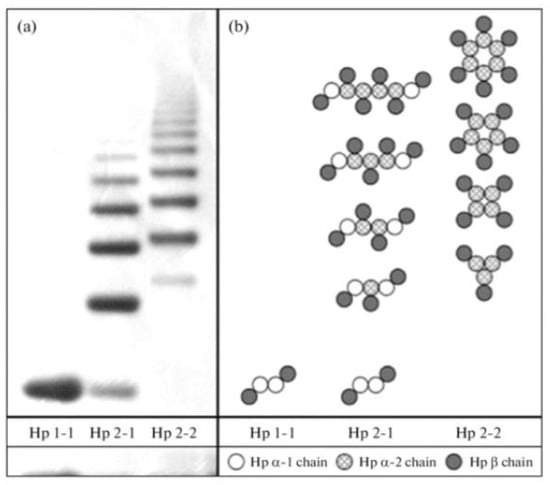 Haptoglobin phenotype evaluation via a native one-dimensional gel electrophoresis technique. Haptoglobin is the protein made in the liver that, in humans, is encoded by the HP gene. (a) specific profiles obtained by electrophoresis in gradient (3-8%0 native PAGE of haptoglobin preparations of various phenotypes. (b) Composition of polymers ot three haptoglobin phenotypes. Three major haptoglobin phenotypes are known to exist: Hp 1-1—homodimers; Hp 2-1—liner heterodimers; and Hp 2-2—cyclic heterodimers. Hp 1-1 is biologically the most effective in binding free hemoglobin and suppressing inflammatory responses associated with free hemoglobin. Hp 2-2 is biologically the least active, and Hp 2-1 is moderately active. In blood plasma, haptoglobin binds with high affinity to free hemoglobin released from erythrocytes, and thereby inhibits its deleterious oxidative activity. Free haptoglobin is removed from plasma in 3.5–5 days. On the other hand, the haptoglobin–hemoglobin (Hp-Hb) complex is removed within 20 min. This known fact stresses the importance of Hbα removal in the presence of Hp. Reproduced with permission from Naryzny et al., Biochem Mosc Suppl B Biomed Chem. Springer Nature, 2021 []. Abbreviations: PAGE, polyacrylamide gel electrophoresis; Hp 1-1, Hp 2-1, and Hp 2-2—Haptoglobin–hemoglobin complex, Hbα, and hemoglobin alpha.