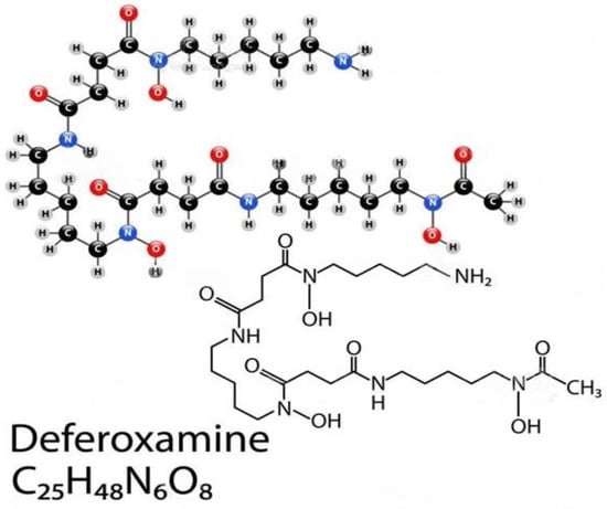 Deferoxamine, also known as desferrioxamine or desferal, is a chelating agent that is utilized to clear away unwanted excess iron or aluminum from the body. It reacts by confining exogenous free iron or aluminum in the bloodstream and reinforcing its elimination in the urine. Reproduced with permission from Cao et al., American Chemical Society, 2020 []. Abbreviations: C25H48N6O8, deferoxamine.