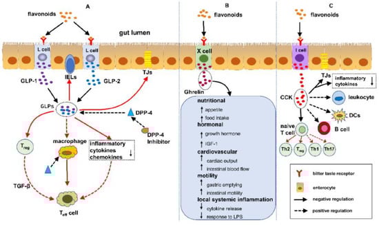 Flavonoids are free radical scavengers and confer a wide variety of antioxidant and anti-inflammatory activities, as depicted in Figure 7 []. Studies have shown that the enteroendocrine system is composed of enteroendocrine cells (EECs) that regulate IBD by monitoring the gut microbiota and controlling the immune response, thus safeguarding the intestines against physical obstacles, as well as modulating gut motility []. Flavonoids have an impact on the enteroendocrine system and safeguard it against IBD, which infers that the alleviation of IBD is possibly associated with the regulation of flavonoids in EECs. Presently, over 4000 multifarious flavonoids have been recognized and ascertained in the bright colors of many fruits and vegetables [,]. Further, a number of studies have reported the effect of flavonoids on enterohormone secretion; however, there are hardly any studies demonstrating the association between flavonoids, enterohormone secretion, and IBD. The interplay between flavonoids, enterohormones, and IBD is herein illuminated in this review. Furthermore, the conclusion can be drawn that flavonoids may safeguard against IBD by regulating enterohormones, such as glucagon-like peptide 1 (GLP-1), GLP-2, dipeptidyl peptidase-4 inhibitors (DPP-4 inhibitors), ghrelin, and cholecystokinin (CCK), a possible mechanism of flavonoids protecting/ shielding against IBD [].