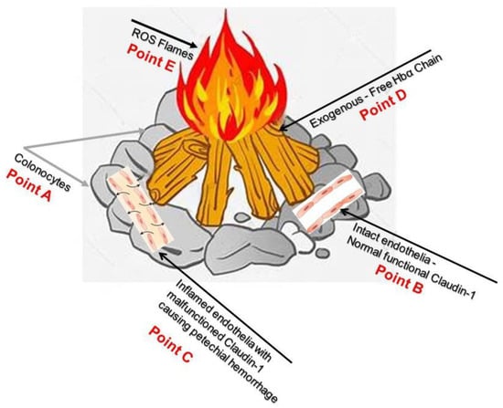 Point A demonstrates colonocytes of the colonic mucosal epithelium, while Point B illustrates intact healthy capillary endothelia with normal functional Caludi-1. Point C depicts active IBD and dysfunctional Claudin-1, the source of potential hemorrhage. Point D show exogenous free HbαCs that cause ROS flames at Point E. Current endoscopic surveillance is inadequate and re-emphasizes the need to look further into the dysfunctional claudin-1 protein; this could hopefully prevent ROS-mediated DNA damage. This figure is a visualization of the pathophysiology of CACRC (A–E). Reproduced with permission from Pinbest.com []. Abbreviations: HbαC, hemoglobin alpha chain; ROS, reactive oxygen species; CACRS, colitis-associated colorectal cancer.
