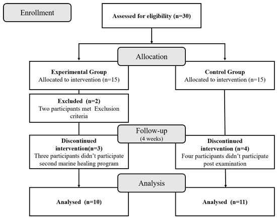 Initially, we recruited fifteen participants for the experimental group and fifteen for the control group for the pre-test. However, after the first marine healing program, two participants were excluded because they met the exclusion criteria. In addition, three participants from the experimental group dropped out because they did not want to participate in the second program. Four participants from the control group participated only in the pre-test and did not participate in the post-test. Thus, for the final analysis, we used the pre-test and post-test results from the ten participants in the experimental group and eleven participants in the control group who participated in all the courses during the four-week study period.