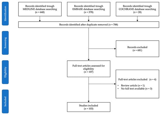 The initial database search identified a total of 1054 studies, of which 266 were duplicates. After screening the titles and abstracts of the 788 remaining articles, 681 were excluded owing to non-pertinent specialty or intervention. After the full-text reading of the 107 eligible articles, a further 4 were excluded since 1 was a review article and 3 did not have a full-text version available. One-hundred and three studies met the inclusion criteria and were selected for the qualitative synthesis of the literature (Figure 1).