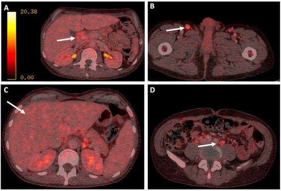 PET-CT scan images. (A): The hepatic hilum lymphadenopathy is marked with arrows. (B): Inguinal lymphadenopathy. (C): Hepatomegaly. (D) Mesenteric lymphadenopathy.