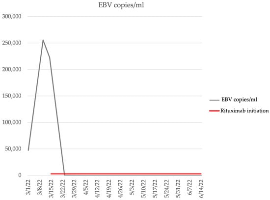 In order to control EBV infection as a possible underlying trigger of HLH, monoclonal antibody Rituximab was added to the treatment. After starting Rituximab on 15 March 2022, the patient’s EBV viremia was negative and remains negative to date (Figure 4).