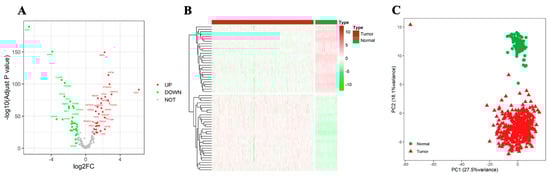 Identification of differentially expressed NTGs. (A) Volcano map of differential NTGs. (B) Heatmap of differential NTGs in OC. (C) PCA analysis.