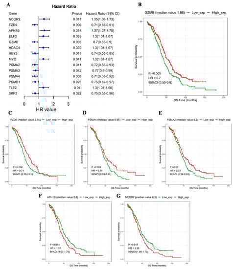 NTGs significantly associated with OS prognosis. (A) Forest map of 14 genes significantly associated with OS prognosis. KM curves in the high- and low-expression groups. (B) GZMB, (C) FZD5, (D) PSMA4, (E) PSMA2, (F) APH1B, (G) NCOR2.