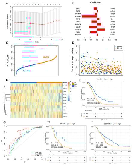 NTG-based prognostic signature constructed by Lasso–Cox regression analysis. (A) Lasso–Cox regression analysis. (B) Histogram of gene weight coefficient. (C) NTRS point figure. (D) Survival time of samples with different survival states. (E) Expression of model genes in high- and low-score groups. (F) Survival analyses of high- and low-score groups. (G) 1-, 5-, and 10-year ROC curves. (H) Survival analysis of OV–AU group with high and low NTRSs. (I) Survival analyses of medium and low NTRS groups from GSE26712.