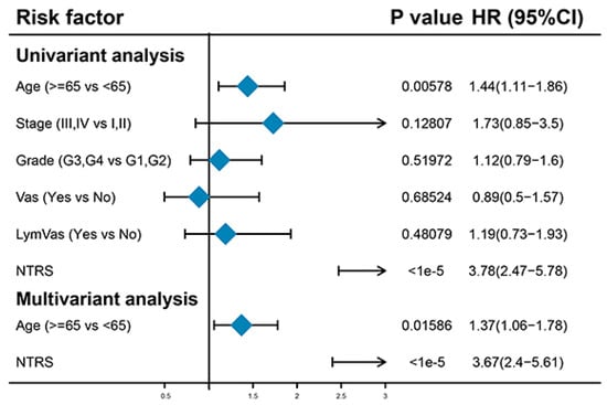 Univariate Cox regression analysis was performed to analyze the relationships of age, stage, grade, vascular invasion, lymphatic invasion, and NTRS with OS. Age and NTRS were remarkably correlated with OS. Multivariate Cox regression analysis based on these two features showed that age and NTRS were still substantially correlated with OS. This result indicates that age and NTRS can be used as independent prognostic factors (Figure 5). Next, age and NTRS were included in the construction of lipograms, and a new risk score was constructed. The indicative efficacy of the two models was evaluated by ROC curves, and the combination of the two models had the best prediction effect (Figure S1).