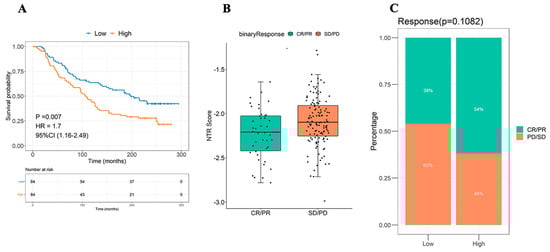 NTRS was calculated using the IMvigor210CoreBiologies dataset, and 168 samples were divided into high and low NTRS groups according to the median NTRS to study the correlation of the high and low NTRS groups with the immunotherapy effect. Survival analysis revealed that high and low NTRS could be used to predict the prognosis of patients undergoing immunotherapy, in which a higher NTRS is associated with a poorer prognosis (Figure 6A). Subsequently, the NTRS of different therapeutic groups were compared. Remarkable differences in NTRS were found between the CR/PR and PD/SD groups (p = 0.011, Figure 6B,C).