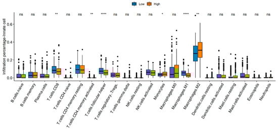 Comparison of immune cell composition between the high- and low-risk groups. * p < 0.05, ** p < 0.01, **** p < 0.0001.