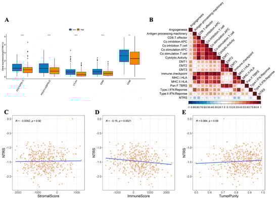 Correlation of risk score with immunity. (A) Distribution of immune checkpoint gene expression between high and low NTRS groups. (B) Correlation between NTRS and immune signature (blank area indicates insignificant correlation). Correlations of NTRS with. (C) stromal score. (D) immune score, and (E) tumor purity. ** p < 0.01, **** p < 0.0001.