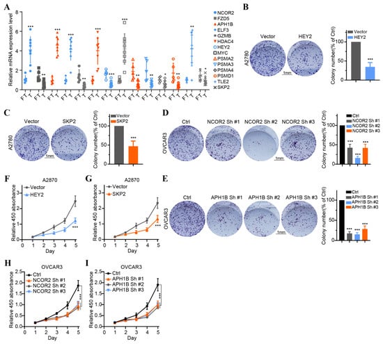 Validation of the expression of 14 overall survival-associated Notch genes in OC tissues and the effect of the four key genes on OC cell proliferation. (A) The expression of 14 overall survival-associated genes in OC and FT tissues was detected by RT-qPCR. (B,C) Colony formation assays of A2780 cells transfected with vector HEY2 and vector SKP2. (D,E) Colony formation assays of OVCAR3 cell transfected with sh-NC, NCOR2-sh1, NCOR2-sh2, NCOR2-sh3 and sh-NC, APH1B-sh1, APH1B-sh2, and APH1B-sh3. (F,G) CCK-8 assays of A2780 cells transfected with vector HEY2 and vector SKP2. (H,I) CCK-8 assays of OVCAR3 cell transfected with sh-NC, NCOR2-sh1, NCOR2-sh2, NCOR2-sh3 and sh-NC, APH1B-sh1, APH1B-sh2, and APH1B-sh3. * p < 0.05, ** p < 0.01, *** p < 0.001.