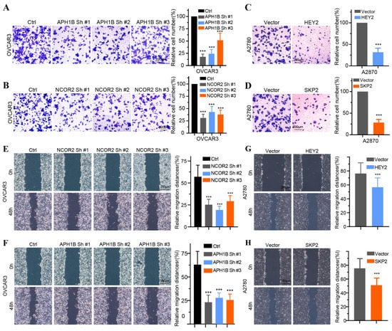 The effect of the four key Notch genes on OC cell proliferation, invasion, and migration. (A,B) Invasion assays of OVCAR3 cell transfected with sh-NC, NCOR2-sh1, NCOR2-sh2, NCOR2-sh3 and sh-NC, APH1B-sh1, APH1B-sh2, and APH1B-sh3. (C,D) Invasion assays of A2780 cell transfected with vector HEY2 and vector SKP2. (E,F) Wound healing assays of OVCAR3 cells transfected with sh-NC, NCOR2-sh1, NCOR2-sh3 and sh-NC, APH1B-sh1, APH1B-sh2, and APH1B-sh3. (G,H) Wound healing assays of A2780 cell transfected with vector, HEY2 and vector, SKP2. *** p < 0.001.