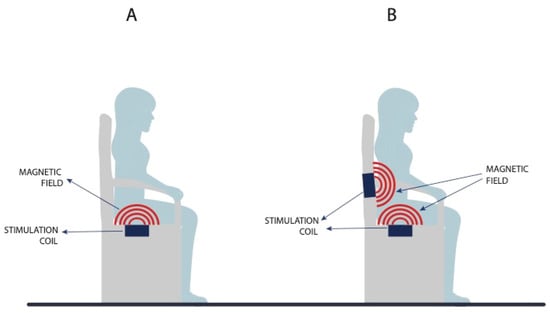 The magnetic field penetrates through the fibers without altering them significantly, and the magnetic field magnitude decreases in reverse proportion to the cube of the distance. The magnetic field current also runs uninterruptedly through clothes, and so patients do not have to take their clothes off during therapy. This is one of the advantages of MS compared to other UI treatment methods [25]. At present, UI is treated with MS therapy on a chair, which can contain only one magnetic field generator installed under the seat, and thus the closest to the pelvic floor muscles, or two generators, with the other one installed in the lower part of the backrest, where it is closer to the sacral plexus (S2–S4) (Figure 3). This affects the UUI symptoms and signs [16,24]. Currently, a 3 T magnetic field is in use; this makes it possible to reach the targeted areas such as the sacral plexus and pelvic floor muscles, and, at the same time, as the measurements and information presented in the literature suggest, prevents tissue overload or overheating.