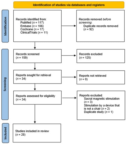 The international standard Preferred Reporting Items for Systematic Reviews and Meta-Analyses (PRISMA) was used to guide the methodology of this SR [19]. To comprehensively evaluate published studies, we conducted a systematic literature review search using Medline, Pubmed, Embase, Cochrane, and ClinicalTrials. All known synonyms were used for the following key search terms: urinary incontinence, magnetic stimulation, and female. All known synonyms were used for the selected words. We reviewed all research articles, with no lower or upper limit of publication year. The last search was conducted on 28 April, 2023. It should be noted that this article only focuses on research articles. We identified the potentially relevant research articles by examining the abstracts or articles as a whole. Titles and/or abstracts of the studies retrieved using the search strategy were screened independently by two review authors (M.P. and A.A.) to identify studies that potentially met the inclusion criteria of this review. The full text of the potentially eligible studies was retrieved and independently assessed for eligibility by another author (D.L.). Any disagreement over the eligibility of particular studies was resolved through discussion with a fourth author (A.L.). We only focused on studies conducted on female patients, in which an MS stimulator was built into a chair.